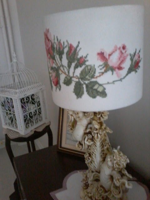 Bursa ketenine işledim, ekru üzerine pembeleri pek yakıştırdım. Sonra da avizeciye gitti bir abajur kalpağı haline gelebilmek için..Kendi kendime kapladıklarım da olmuştu daha önce ama, bu sefer evladiyelik olsun, yıkayıp yıkayıp kullanılsın istedim, sonuçtan da çok memnun kaldım..